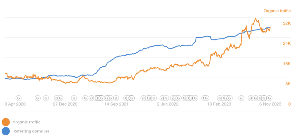 High DR backlinks like these contributed to high traffic growth and a Domain Rating growth from the low 40s to 65.