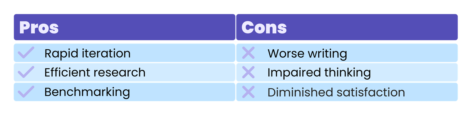 Unsurprisingly, there is a lot of commonality among the cons described by leading publications. These include concerns about plagiarism, lower rankings in search results, inconsistent quality, and lack of creativity.